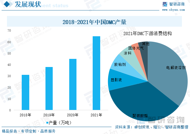 电池级DMC作为最常见的电解液溶剂,深受锂电池产业高质量发展影响,在锂电池产业拉动下,叠加近两年非光气法聚碳酸酯大量投产,DMC替代光气作为羰基化试剂,需求大幅度增长,我国DMC 产量逐年增加。全球DMC产能大多分布在在中国、日本与韩国等地,我国是DMC最大生产国,截至2021年,国内DMC产能约120万吨,山东和华东地区为我国DMC主要生产地,2021年我国DMC产量约65万吨。DMC不但可以用于电解液,还可大范围的应用于聚碳酸酯、涂料、胶黏剂、显影液等领域,其中72%的DMC用于电解液与聚碳酸酯领域,显影液占比9%左右。